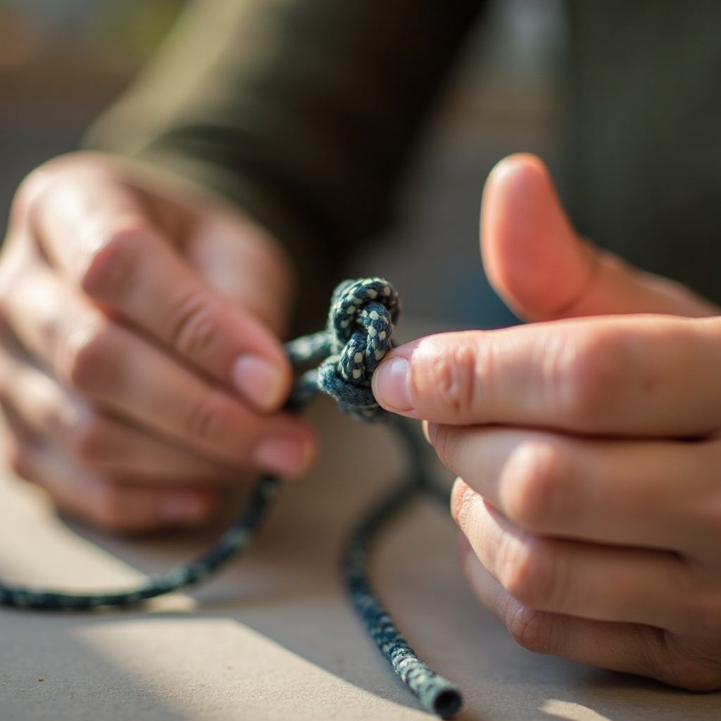 Stellen Sie sicher, dass der Knoten fest ist, indem Sie beide Enden fest ziehen, und verwenden Sie gegebenenfalls einen Tropfen klaren Nagellack oder Kleber zur zusätzlichen Sicherheit.